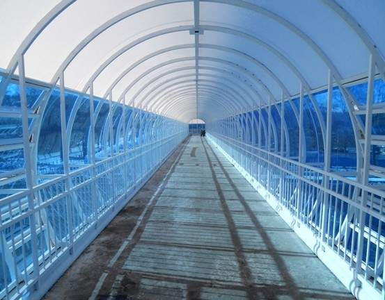 Об эстетичности надземных переходов следует сказать отдельно. Специалисты нашей компании проектируют настолько изящные, красивые и воздушные каркасы, что на первый взгляд они кажутся хрупкими и уязвимыми. Но эстетичность вовсе не мешает им быть прочными и абсолютно безопасными как для пешеходов, так и для движущегося внизу транспорта.